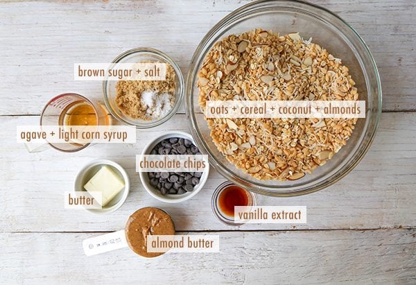 - In a small sauce pot, combine butter, agave syrup, corn syrup, almond butter, brown sugar and salt. Set over medium heat and stir to combine. Heat until butter has melted and mixture is creamy. Remove from heat and add vanilla extract. Pour mixture over oat mixture. Fold to combine. Once almond butter mixture is thoroughly incorporated, add chocolate chips. Fold until distributed.