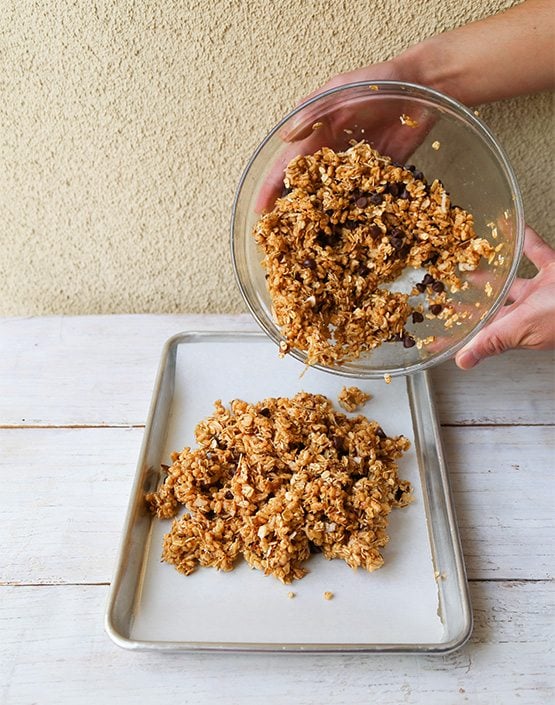 - Transfer to prepared parchment lined baking sheet. Spread mixture out evenly, using a spatula or your hands. Another option- take a similar size baking sheet and press down over mixture to ensure even layer. Don’t press to hard, otherwise granola will be very crunchy and dry.