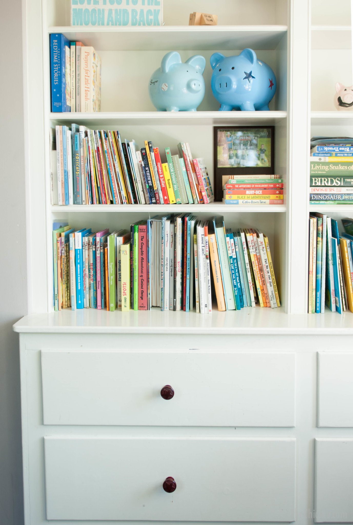 These built ins were here when we moved in… though they were a terrible color at the time. We just sanded them, painted them and added the cute knobs.