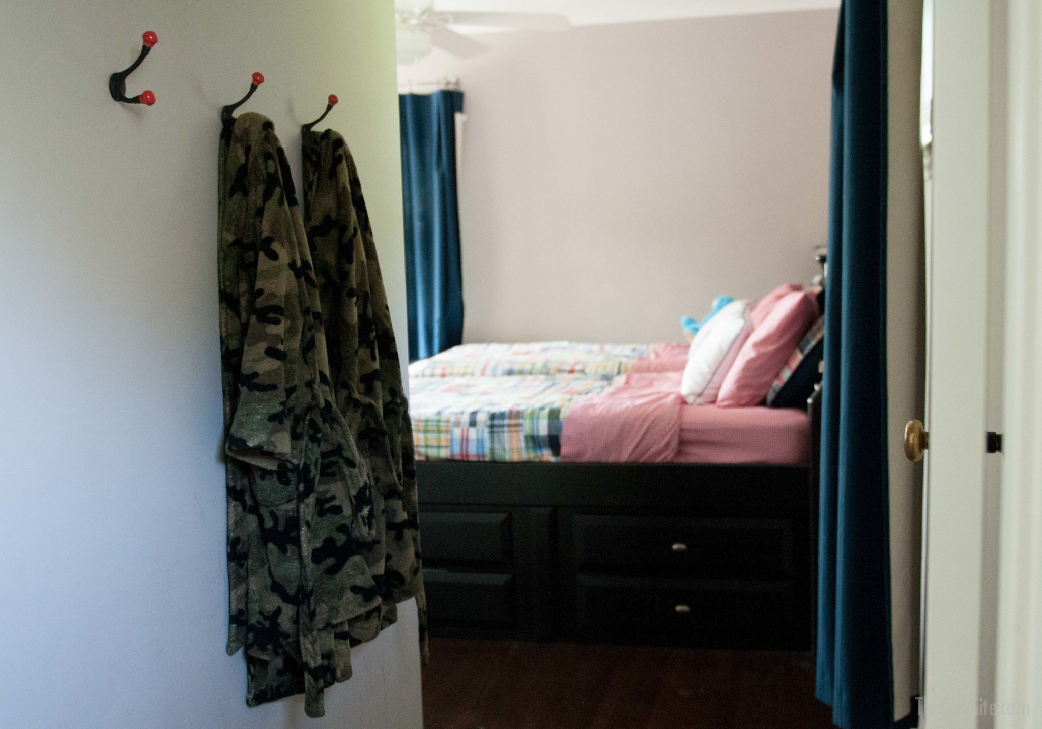 I like giving the boys as many options as possible to help them keep their own spaced organized. This line of hooks by their door is where they hang up their robes and their sweatshirts after school.
