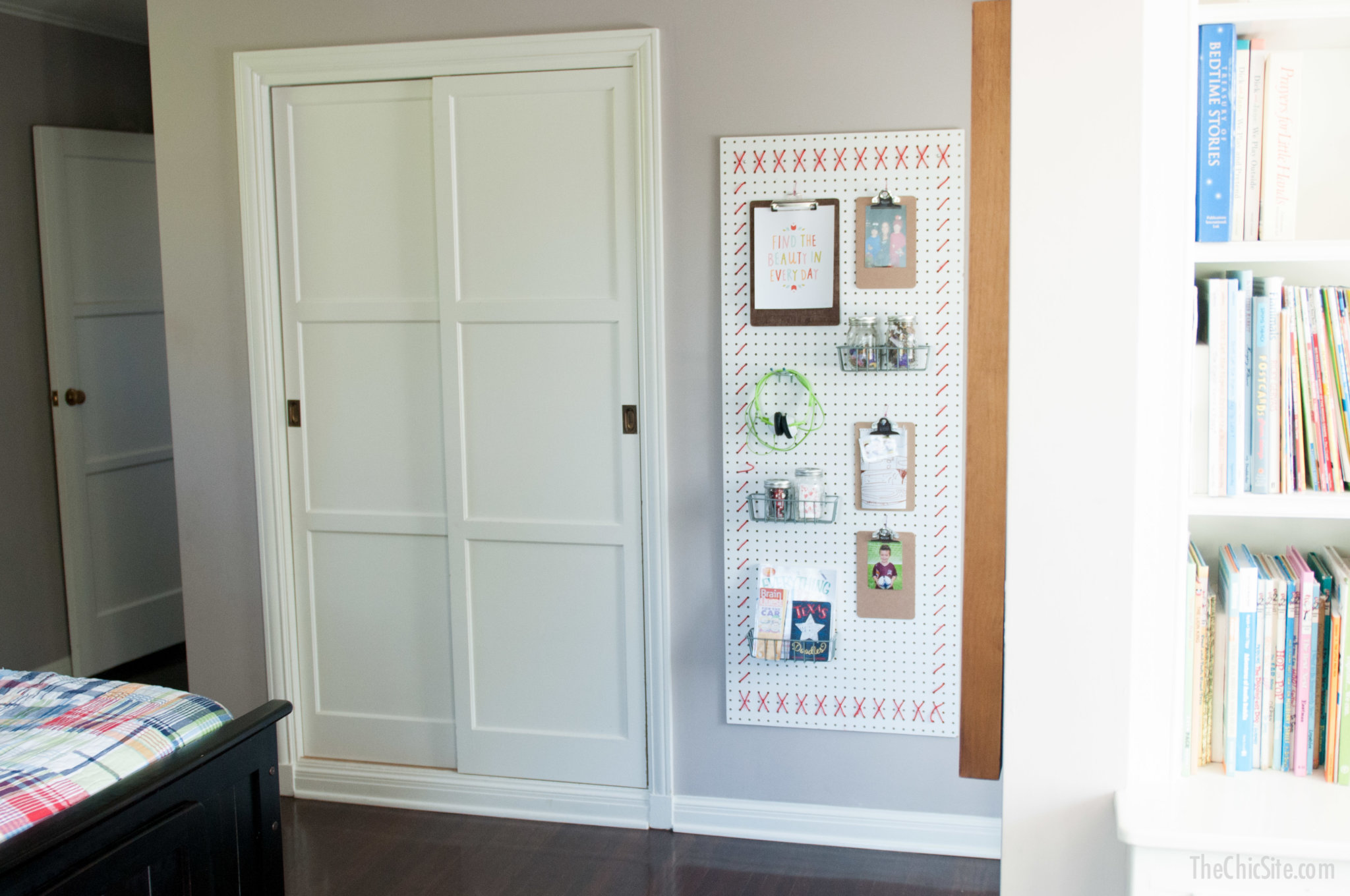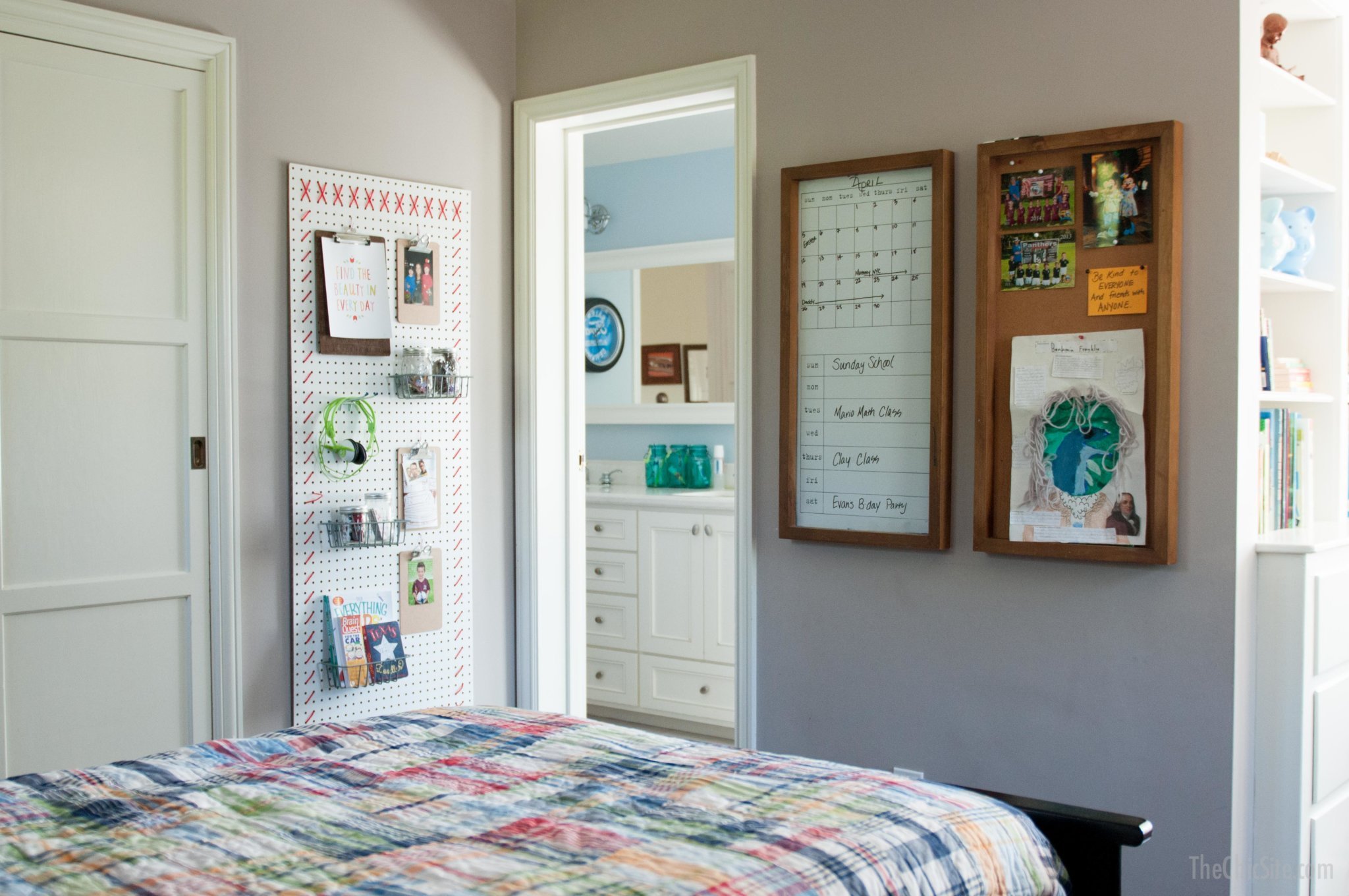 The Peg Board Wall art is a really cool way to organize and decorate a boys bedroom and you can find out how I made it in this post.