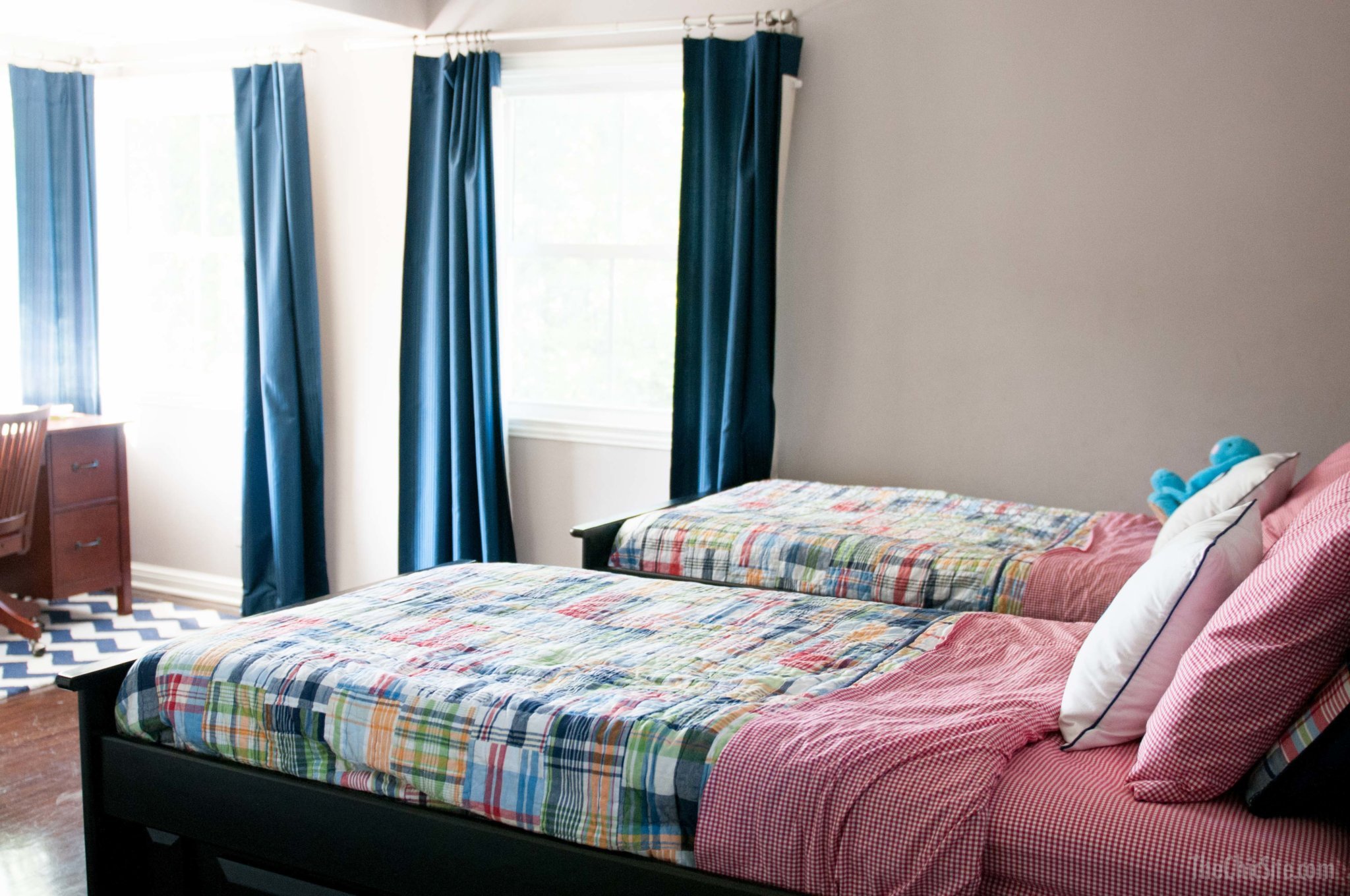 These blackout drapes from Target were a lifesaver for us!! They keep the boys bedroom dark in the morning so they don’t wake up (and wake us up!) at the crack of dawn!