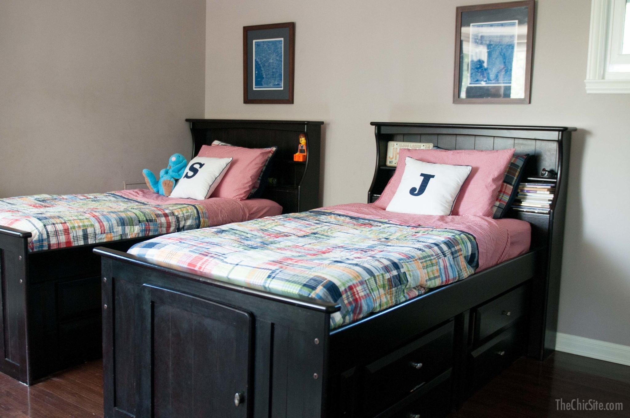 The wall art above their beds are blueprints of New York and Los Angeles that I found on Etsy. I was trying to think of a pair of something and I thought East Coast/West Coast was a cool idea. I just bought the prints and then framed them myself.