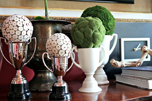 Since fall is all about gathering and harvesting, grouping collections like candlesticks, vases or in my case trophy cups is an easy way to give a vignette a fall look just by rearranging what you already have.