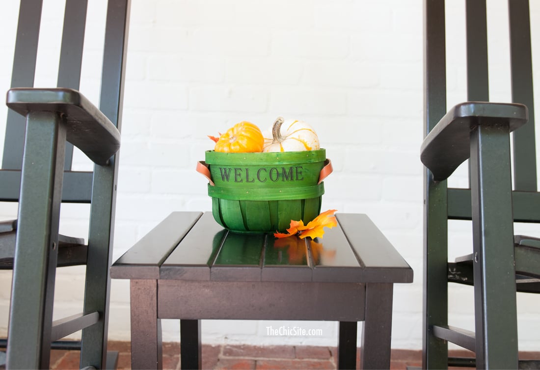 I switched out the little plant that usually sits between my rockers for a small basket filled with little pumpkins. Even if you can’t do anything else but this, it’ll be an adorable little welcome for your guests.