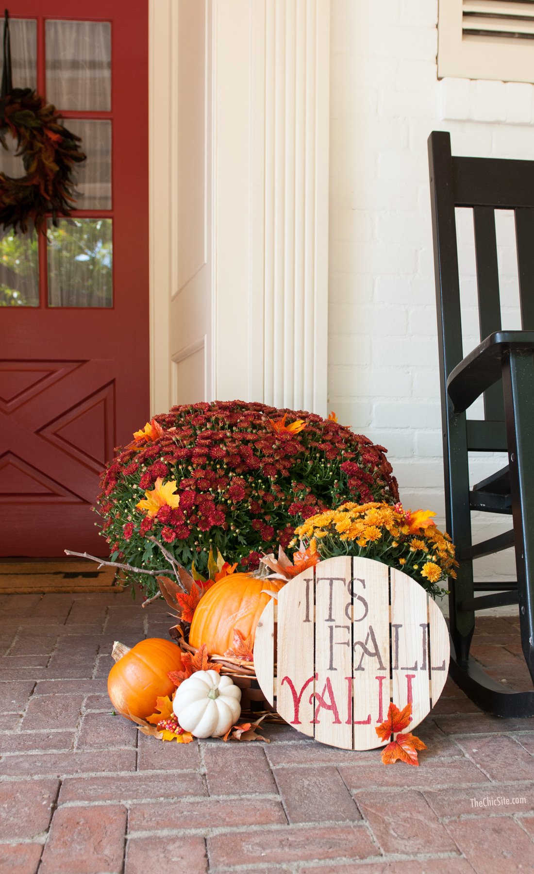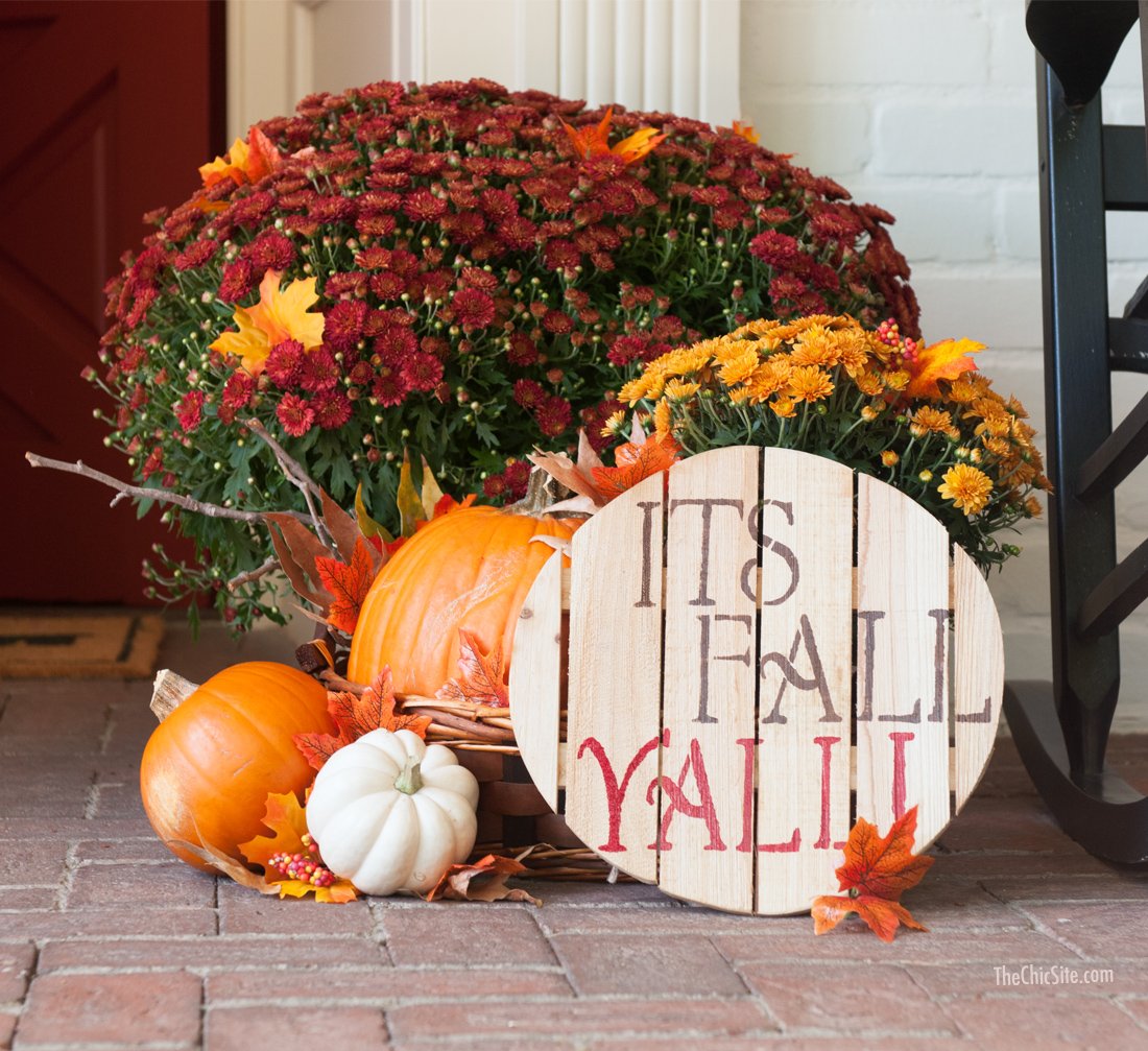 I love decorating my front porch for any and every holiday. I’ve done moss covered monograms and Halloween wreaths. I’ve done Christmas pieces covered with holly and even turned my door into an Easter bunny. But it’s fall now and even if the weather in LA doesn’t want to cooperate with my desire for crisp, windswept days my front porch definitely will!