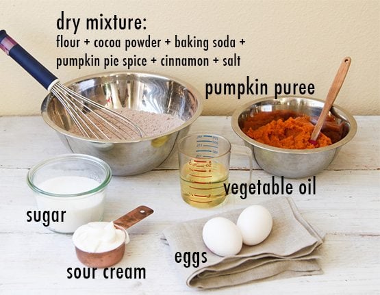 2. In large bowl whisk together flour, cocoa powder, baking soda, pumpkin pie spice, cinnamon, and salt. If cocoa powder is lumpy, sift all the dry ingredients together.