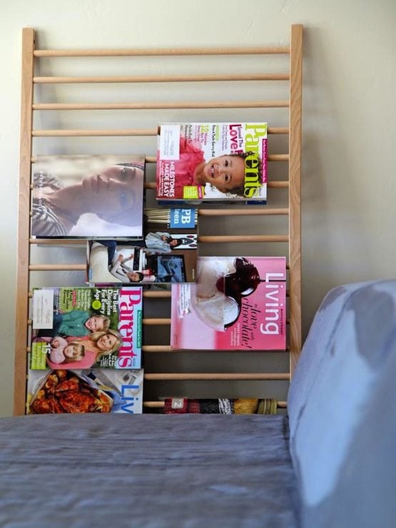 Once your little one gets too big for their crib, repurpose the crib railing as a magazine rack like Nikki McBride of Salty Pineapple shows us above!