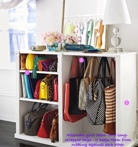 Having a stand-alone purse shelf is such eye candy to me! Here Lucky Magazine shows us that having shelving for clutches and hanging space for bigger purses is ideal.
