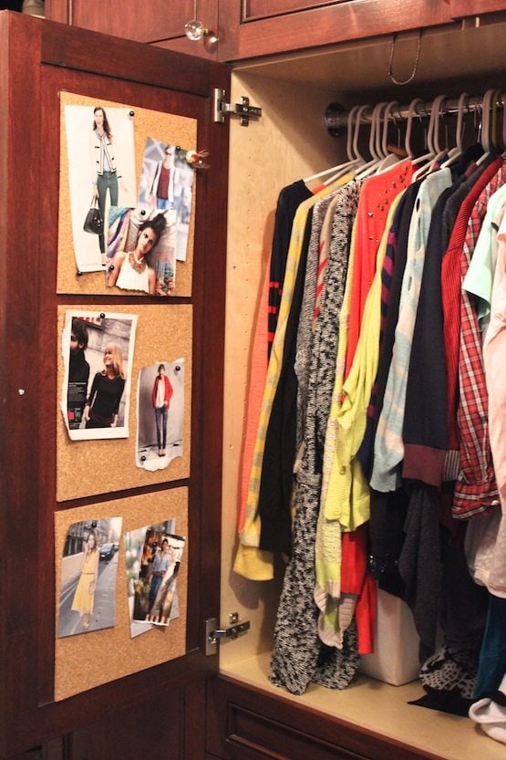 In Rachel‘s closet, she hung up an inspiration bulletin board on the inside of her closet doors. She hangs up fashion magazine clippings to inspire her to try new outfit combinations. If she sees a combo that she loves, like a peter pan collar under a knit sweater, she’ll pin it up until she tries it out and then “Vuala!” she has a new look for her repertoire.