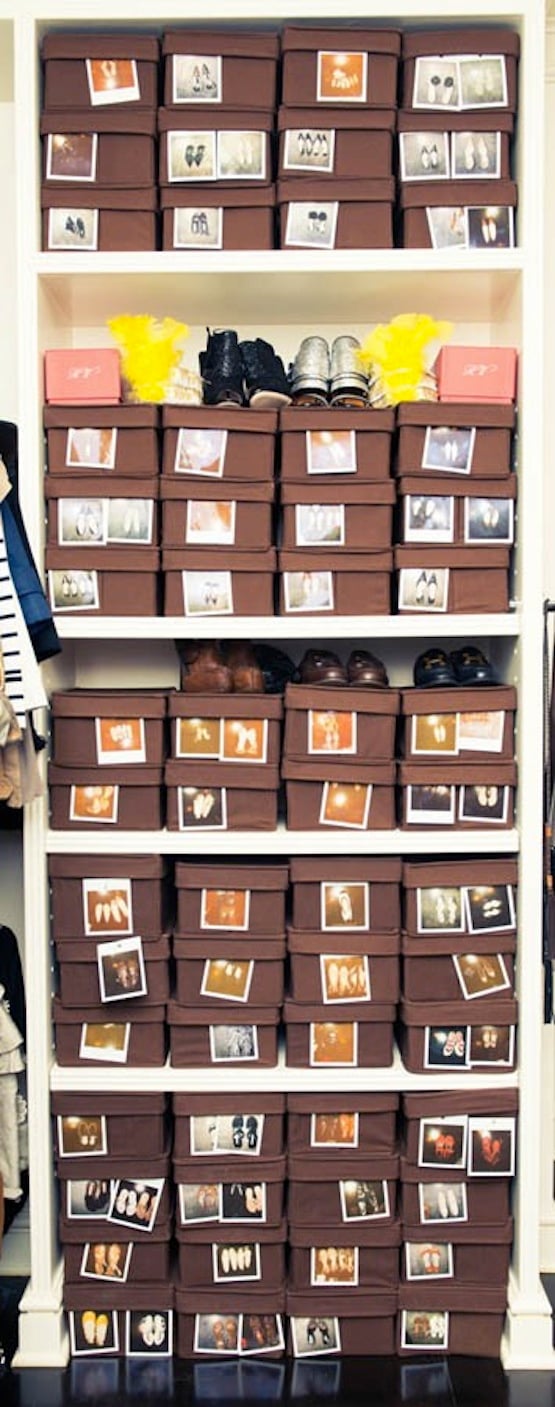 Purchase a bulk amount of shoe boxes and go to town with a polaroid camera. This leads to a super neat, organized and chic shoe display. If you like this canvas shoe box look, you can get some HERE!