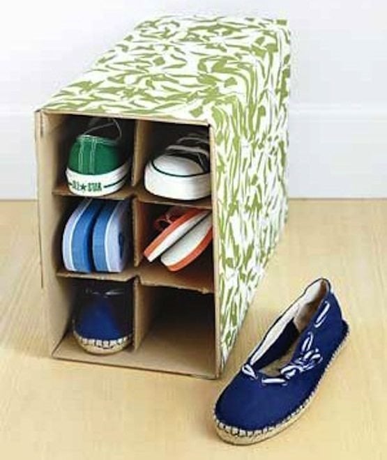 Use a wine box as a DIY shoe organizer. Real Simple suggests wrapping it in pretty paper to add an extra touch of chic!