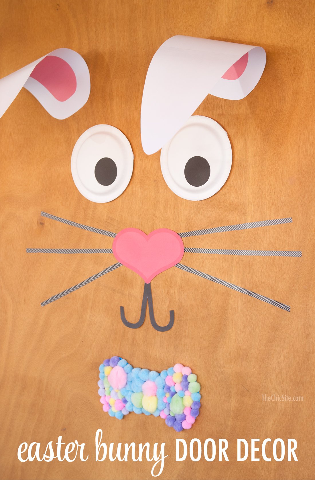 Attach black eyes to paper plates with glue or double sided tape. Attach the bunnies eyes to the door using double sided removable mounting tape. Next attach the bunnies nose with removable mounting tape and use Washi tape to create whiskers. Attach the ears to the door (with removable mounting tape) at the bottom and halfway up the back of the ear… this allows them to flop forward. Just make sure you put the ears low enough that they won’t get stuck in the door.
