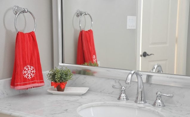 A simple hand towel and some greenery adds the perfect amount of holiday spirit in Megan’s (Honey We’re Home) bathroom. Such an easy thing to do – and you’re all set for holiday entertaining!