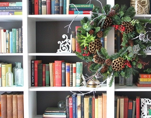 For those of us that work from home adding some holiday spirit to your work space can definitely brighten your day. Why not hang a wreath on a bookshelf like Emily A. Clark?