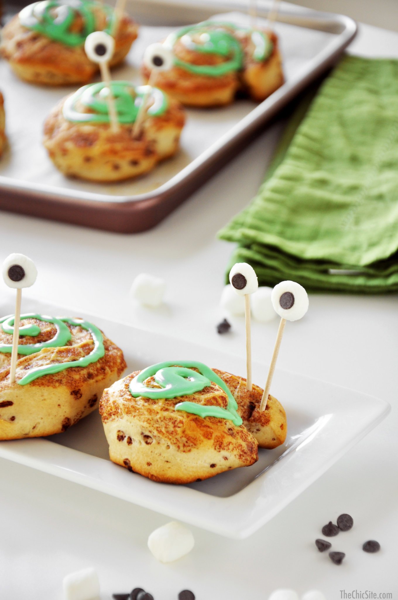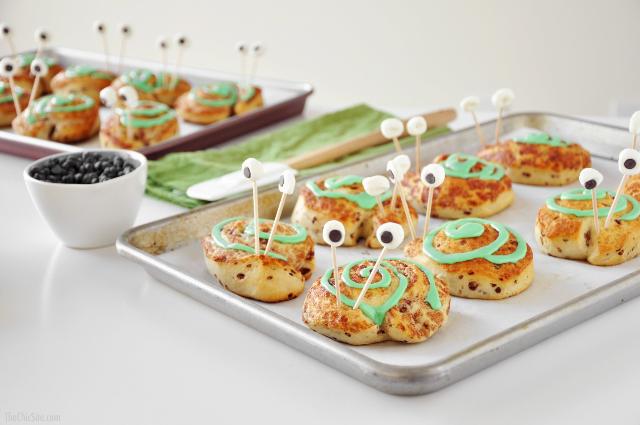- To create the eyes, press a mini chocolate chip onto the side of each mini marshmallow. Skewer them with a toothpick and then place two onto each cinnamon roll. Serve immediately.