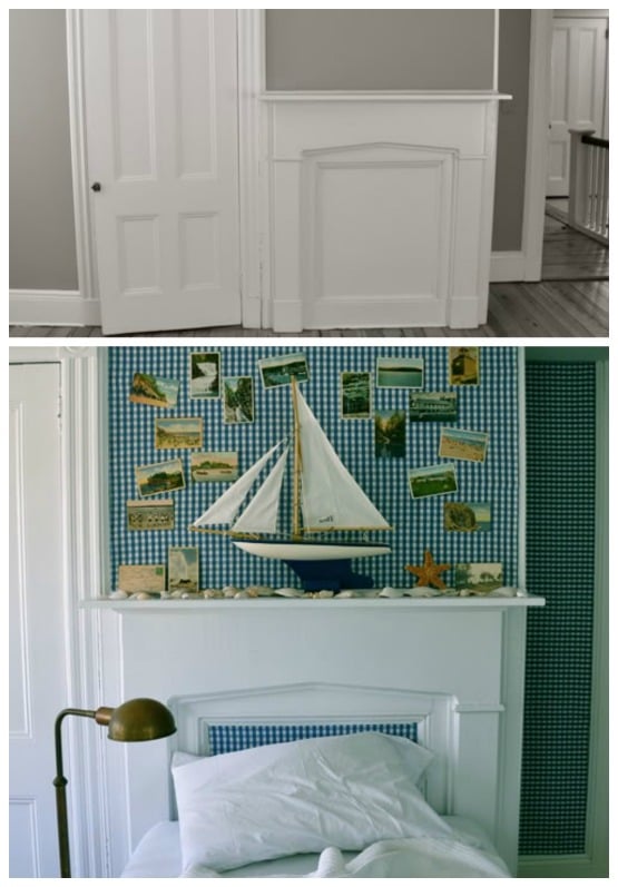 Last but not least is a wonderful idea for anyone living in an older home. So often older homes have oddly placed non-working fireplaces in the bedrooms. Turning it into a headboard is a genius idea, and Nibs blog executes this so well.