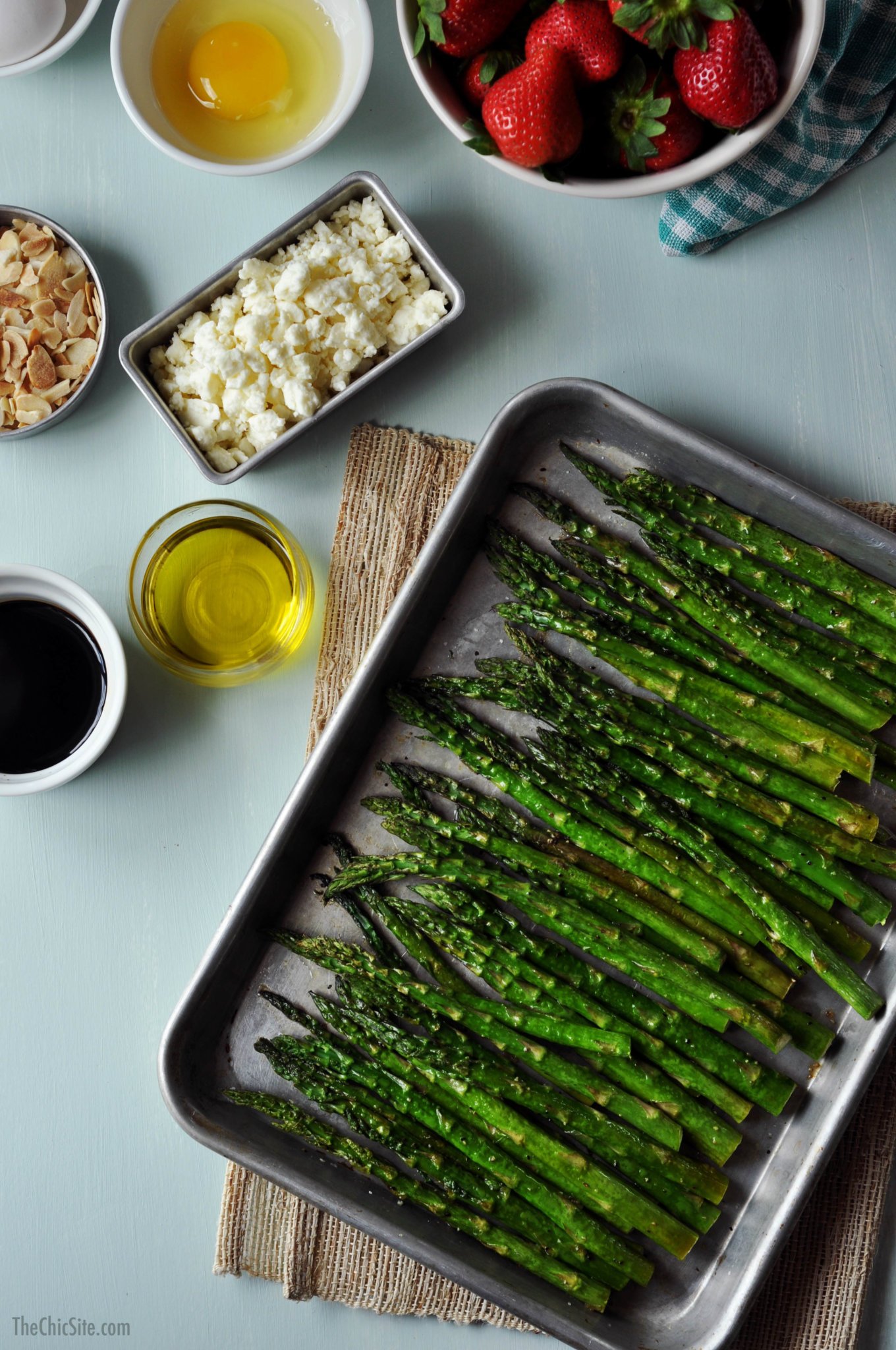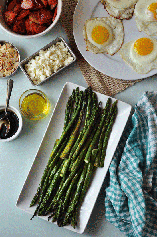 - To assemble the salad: lay down the asparagus and top with balsamic strawberries, crumbled feta, toasted almonds and with the fried eggs. Enjoy!