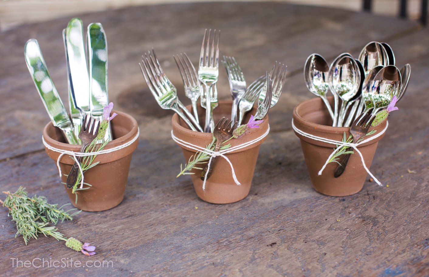 Once your pots are decorated just fill them up with silverware and add to the party buffet… you will need to refresh your herbs for each party as they won’t stay fresh outside of water!