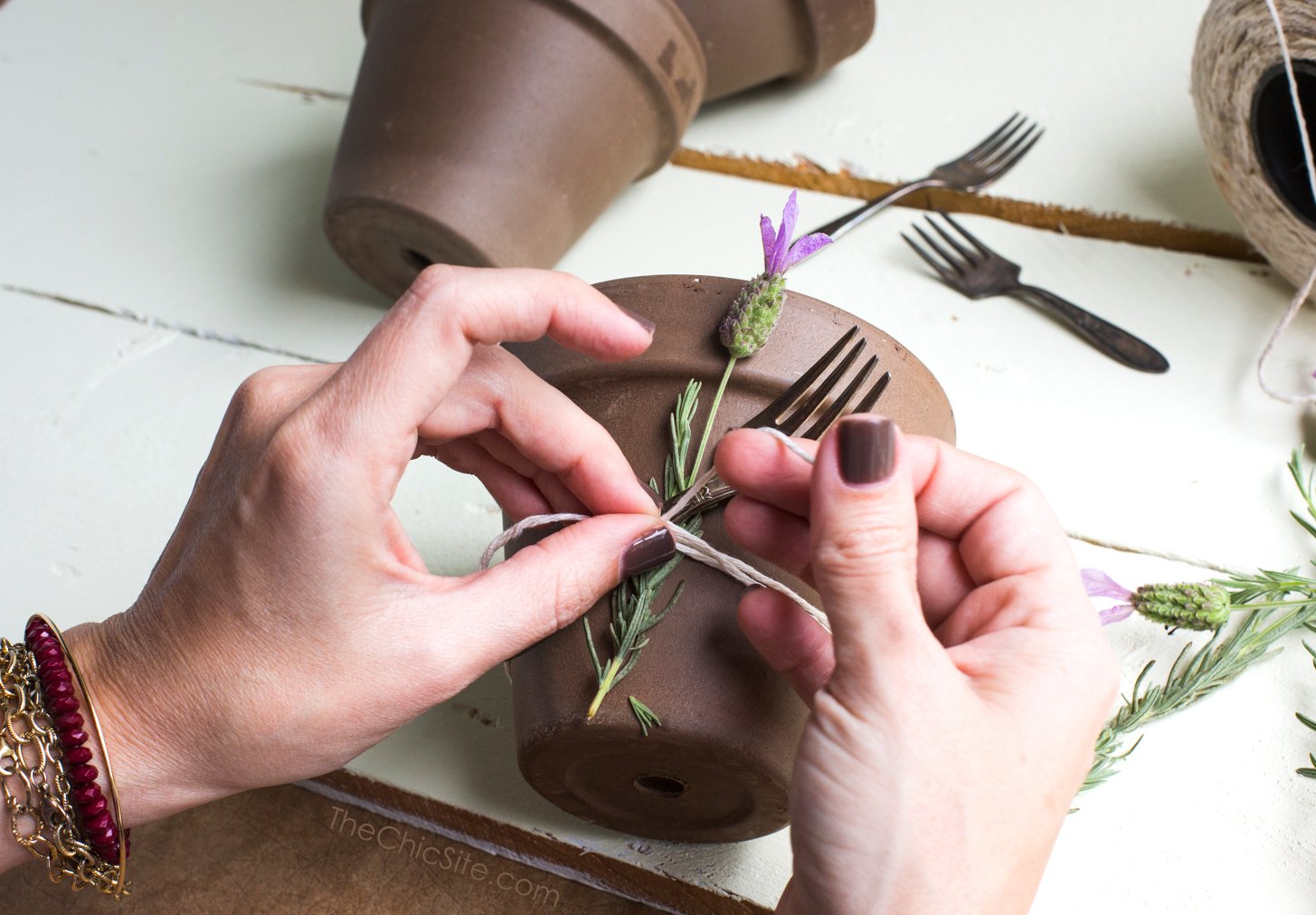 Use the kitchen twine to wrap the herbs and the accessory in place on the top lip of the pot (see photo below). I wrapped mine around twice and then tied a knot. Please note, my string was wrapped tightly and the fork wasn’t heavy… both of these are key to holding your accessories in place.