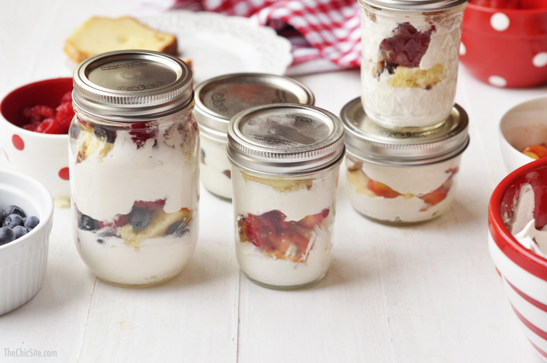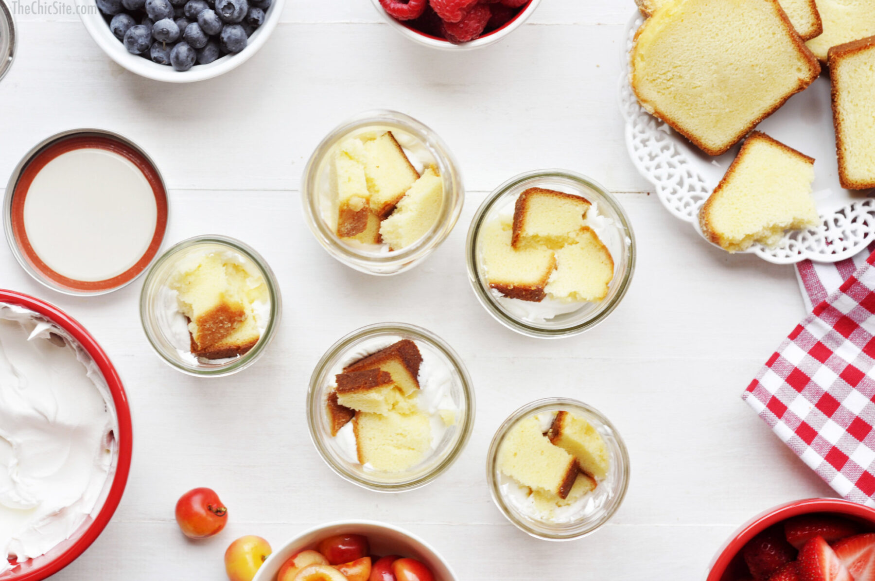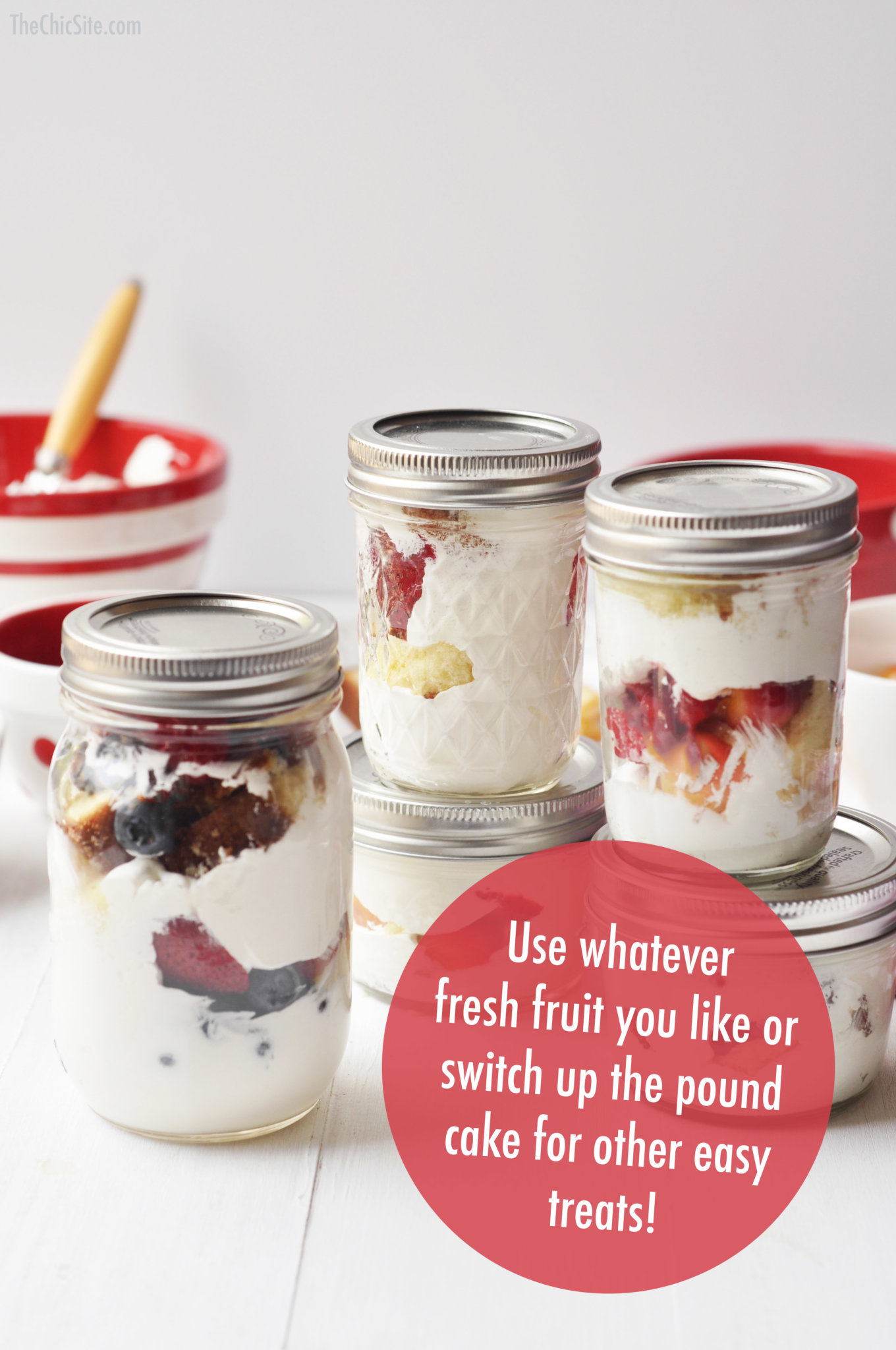 - Fill the mason jars with the ingredients, layering with the whipped topping, pound cake pieces and fresh fruit until you reach the top. Cover tightly with lids and place in fridge until ready to serve.