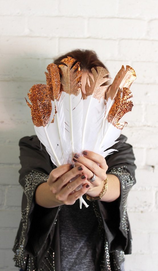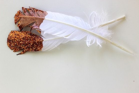 Chic Tip – Add your feathers to a centerpiece, give them out as bookmarks, party favors or even put them in your hair. They can be tied on to presents as a fun embellishment, dropped into your pen jar for some fun, or used in a holiday wreath… I mean honestly, when you’ve got glittery bronze feathers on hand, the uses are endless!! ~Rachel