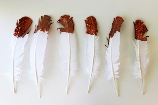Dipping feathers in paint is not exactly necessary, but it certainly is fun and chic and I can think of at least 12 places to use these feathers over the holidays or at my next party. The color combination is completely up to you, but I think there’s something fabulous about feathers and the rustic colors of autumn.