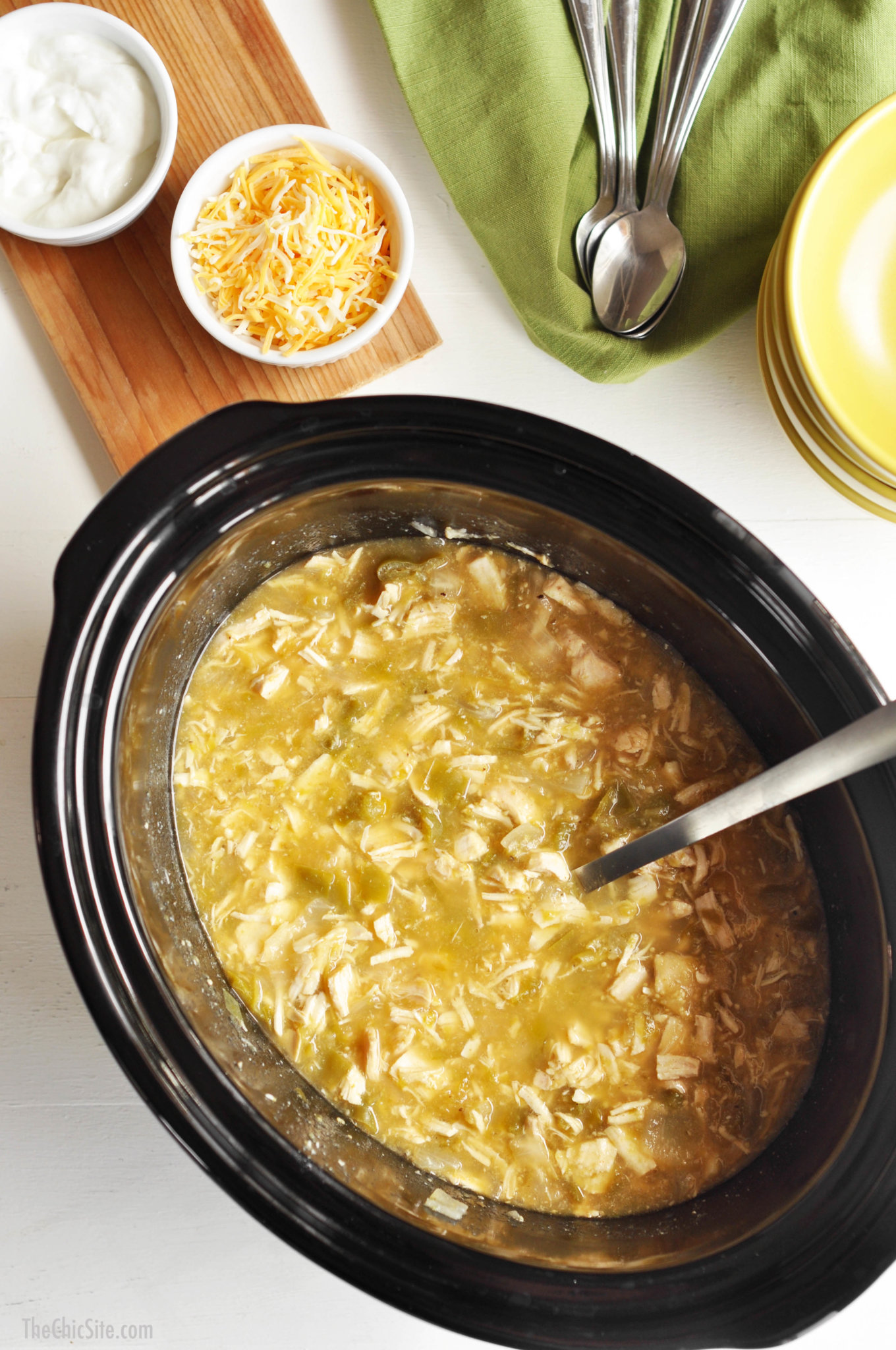 - Combine all of the ingredients in the bowl of a slow cooker (except the toppings, of course). And cook on low for 6 to 8 hours or on high for 2 to 4 hours. Right before serving, take the back of a spoon or a potato masher and break down the chicken into smaller pieces. Garnish with desired toppings and enjoy.