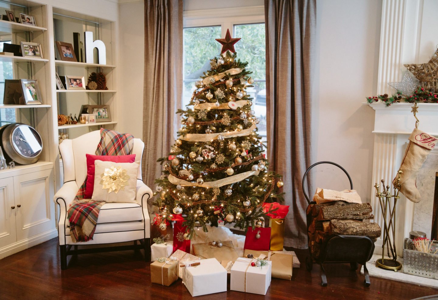 I started with the tree because it’s the focal point that ties everything together. Get a little variety this year for your Christmas tree by picking a new color scheme. I went with gold, white and silver. This look is easier to achieve then you think. I bought two tubs of gold and silver matte glitter ornaments for less than $10 each! The addition of these ornaments instantly added some glam the look of the tree.