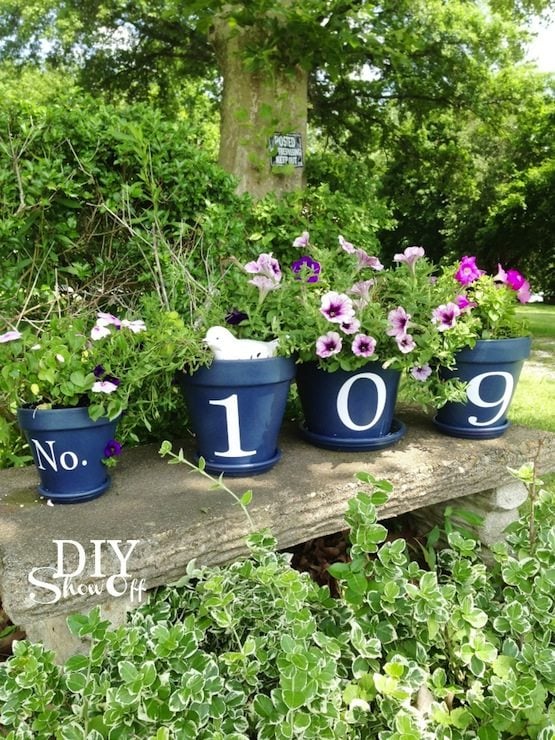 DIY Show Off makes great use of their flower pots to display house numbers in their garden.