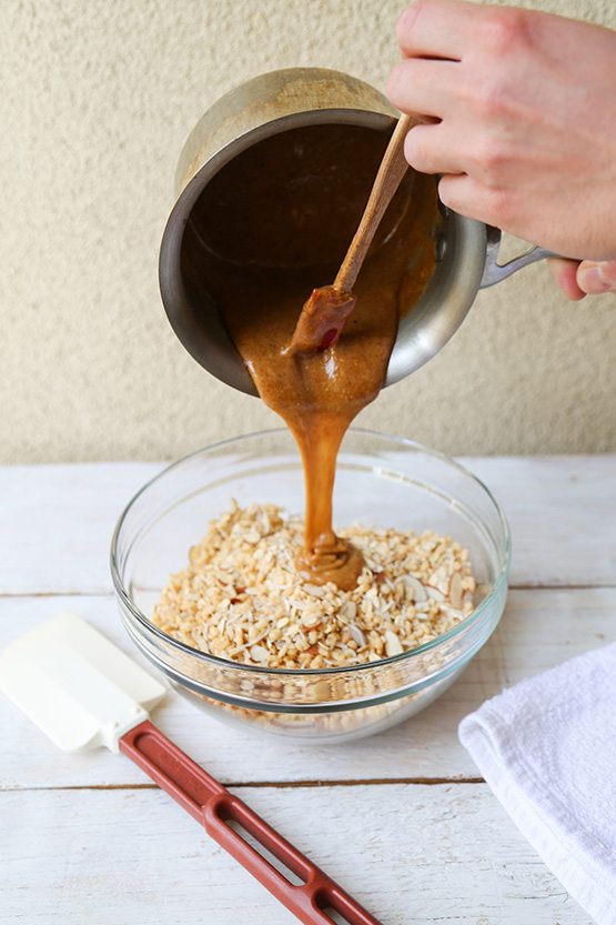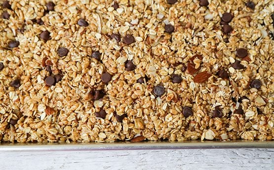 - In a small sauce pot, combine butter, agave syrup, corn syrup, almond butter, brown sugar and salt. Set over medium heat and stir to combine. Heat until butter has melted and mixture is creamy. Remove from heat and add vanilla extract. Pour mixture over oat mixture. Fold to combine. Once almond butter mixture is thoroughly incorporated, add chocolate chips. Fold until distributed.