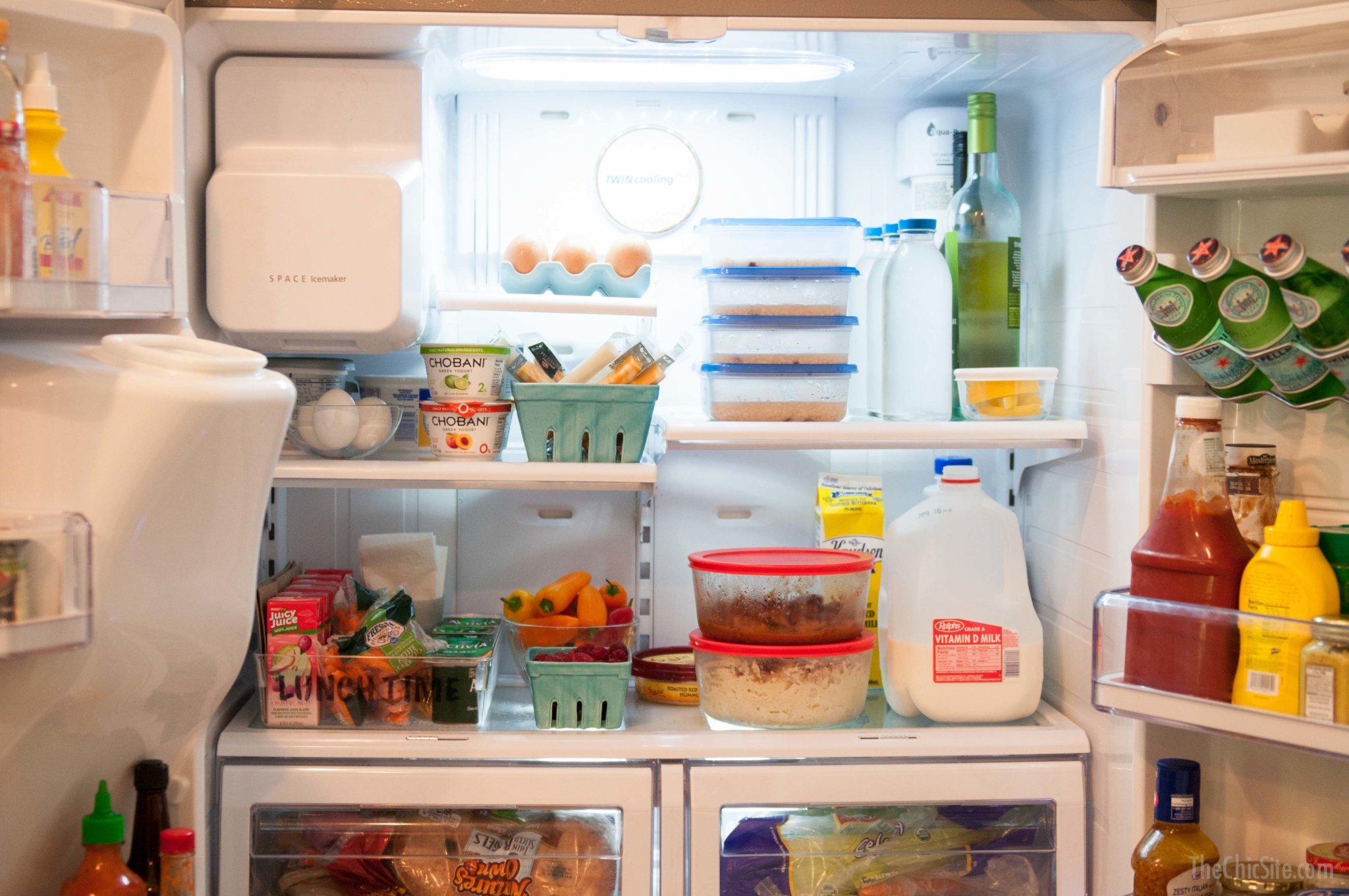 So I’ll start by saying that my “diet” is a lot of protein, diary, fruits and veggies… which basically means, I try and steer clear of breads, rice, pasta, etc. I tend to eat about 4-6 small meals a day, with dinner being my biggest. I know most people will tell you dinner should be your smallest, but that’s when I sit down and eat with my family so that’s the way I do it. I also keep everything that’s on my daily diet at EYE LEVEL in my fridge so when I run into the kitchen starving (this happens at least 8 times a day) I open it to a ton of great options… because believe me, if I open it and there is cold pizza in my face, I’d down three slices before I could help myself.