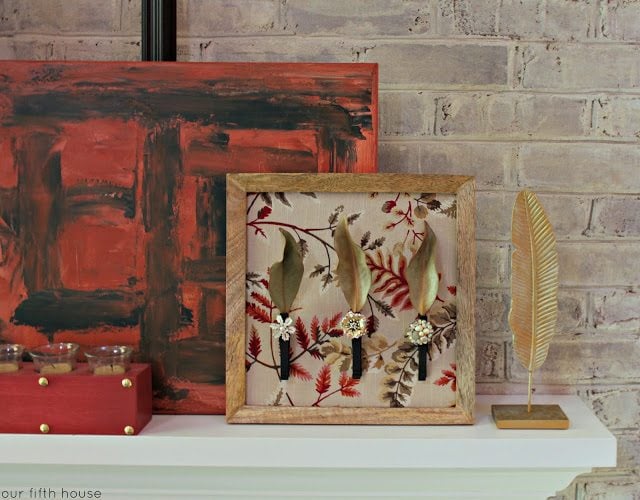 A framed napkin is an easy way to add in some fall color. Here I combined 2 tips – bringing in some dried magnolia leaves from the yard and layering them over a framed napkin to create a simple no cost diy art piece for the season.