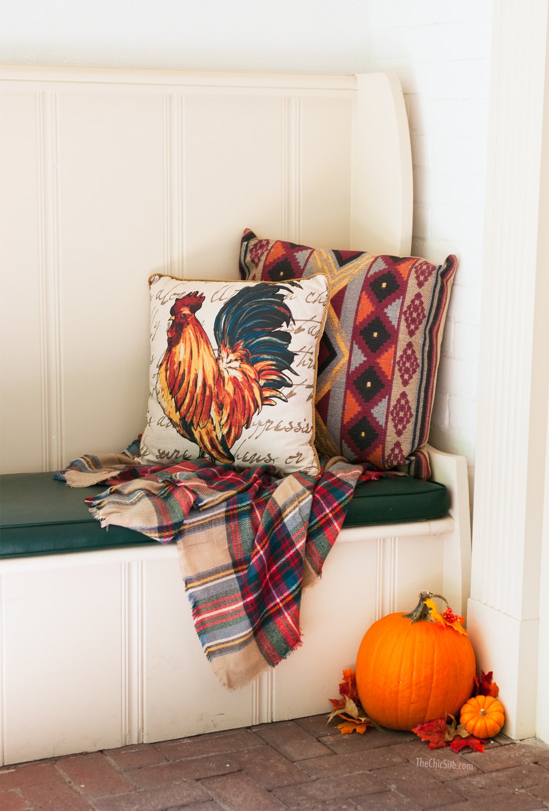This cool bench was something we inherited when we bought our house. If you have any kind of seating on your porch consider using it in the decor. I found the chicken pillow at Michaels and the pillow behind it was something I pulled out of our guest room. The “blanket” is actually one of my scarves.
