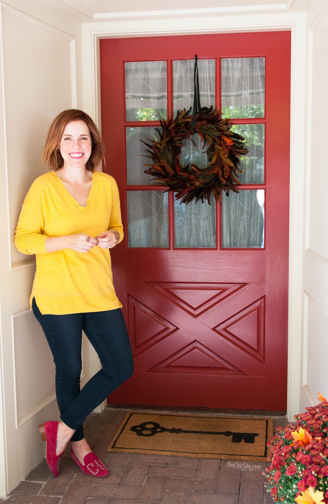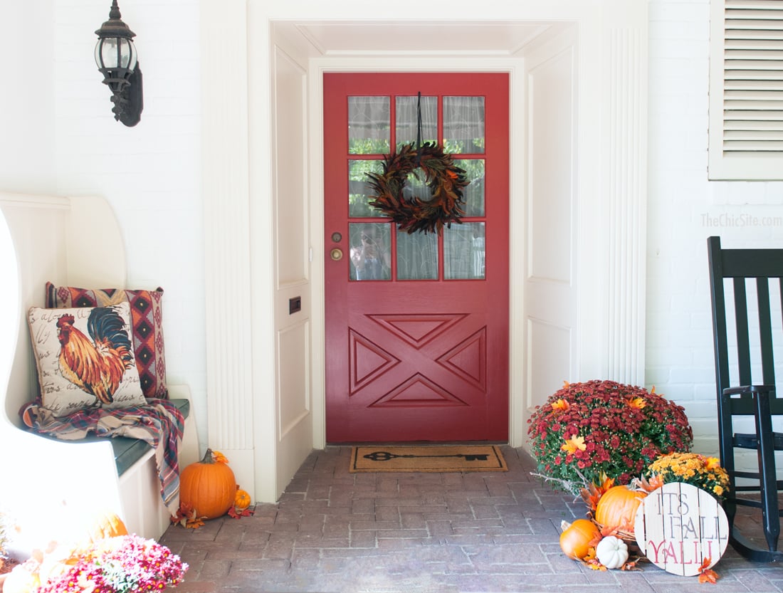 I love decorating my front porch for any and every holiday. I’ve done moss covered monograms and Halloween wreaths. I’ve done Christmas pieces covered with holly and even turned my door into an Easter bunny. But it’s fall now and even if the weather in LA doesn’t want to cooperate with my desire for crisp, windswept days my front porch definitely will!