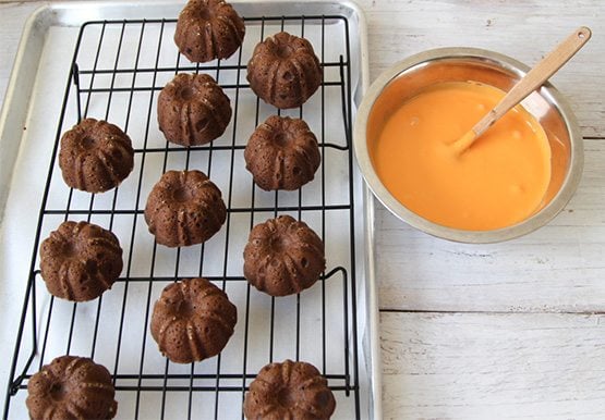3. Arrange cooled mini cakes on a wire rack. Place parchment paper underneath rack to catch any glaze drippings.