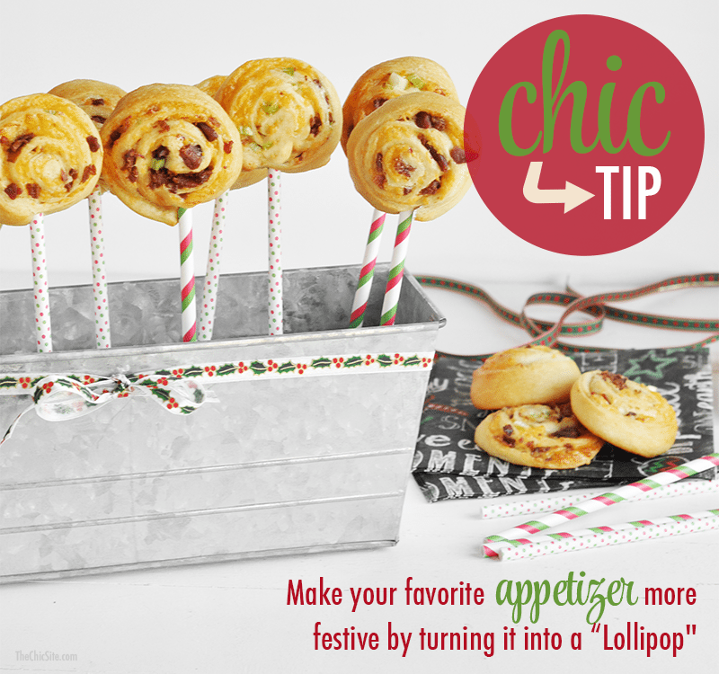 Remember that height is what will make your buffet feel dimensional and full. If you don’t have cake stands just flip a matching bowl upside down and use it to hold up your plate. I also love the idea of serving these Bacon Cheddar Pinwheels as “lollipops”. It makes for a great savory appetizer amidst all the desserts on the table!