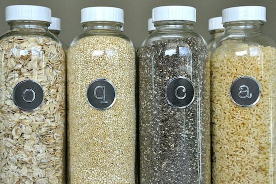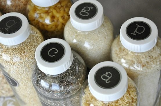 GT’s Kombucha drink is an incredibly popular fermented tea drink here in Los Angeles. I personally love it for two reasons: the crisp flavor and the sturdy glass bottles they come in. I avoid it for one reason – they’re so expensive! So here, Peas & Crayons shows us how to get a bang for the buck by repurposing Kombucha bottles into pantry storage.