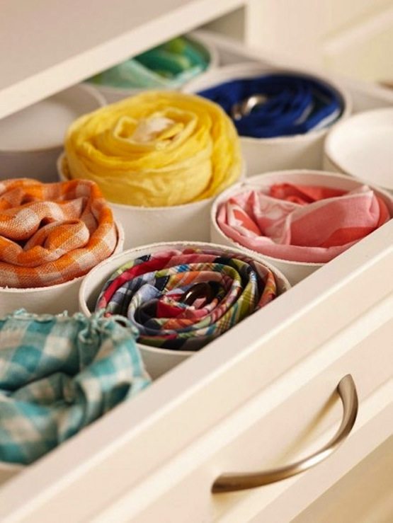 This drawer is the perfect scarf and tie organizer. By using PVC pipe as a drawer divider, Better Homes and Gardens is debunking the messy drawer forever!