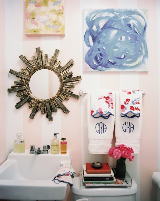 Monogrammed hand towels make a happy statement in this guest bath featured in Lonny Magazine.