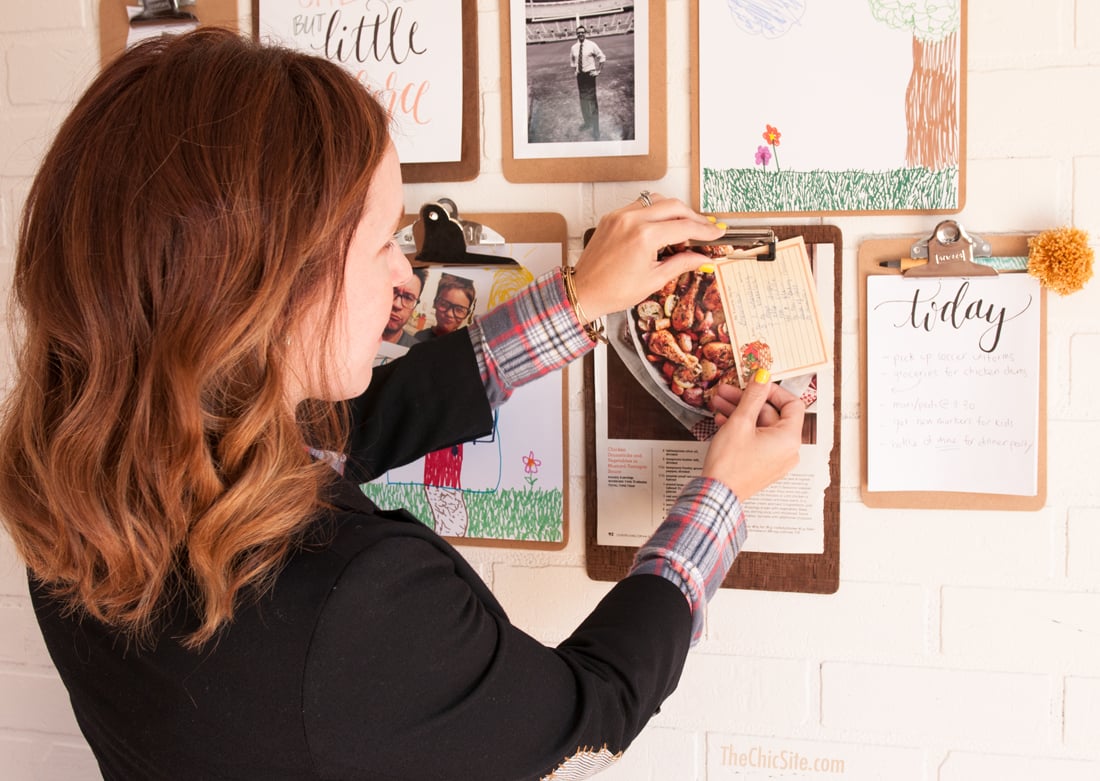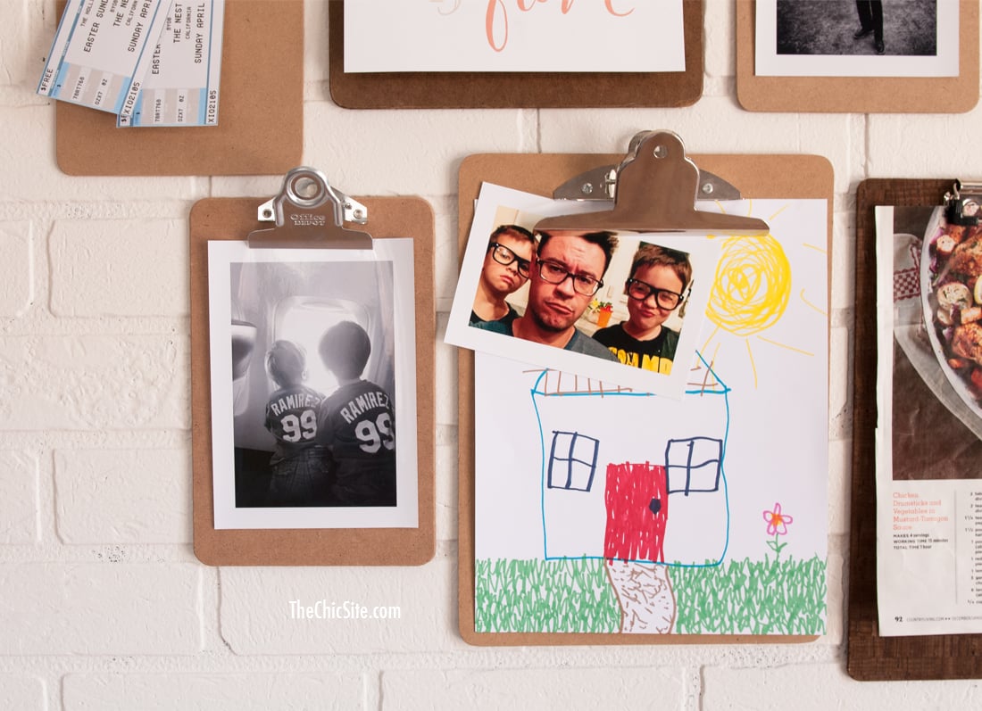 Just like with the display I made in the boys room I hung all kinds of stuff on my clipboards. Recipes I want to try, kid’s drawings, tickets to an upcoming event, family photos… basically anything that was formerly stuck to my bulletin board is now on display here.