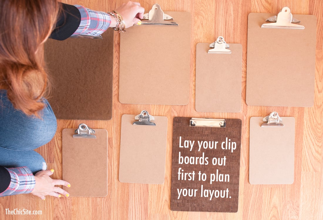 Start this project by collecting a handful of clipboards in various sizes and finishes. I used brown but they sell every color of clipboard imaginable so aim for something that matches your home decor. Next lay out your design on a flat surface so you can figure out exactly how you wan to display your clipboard gallery wall… I just used the floor!
