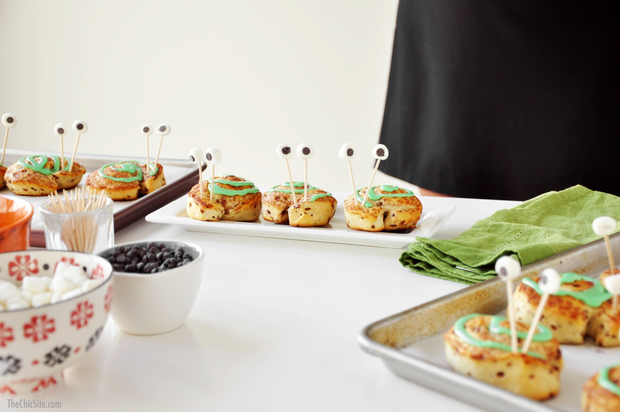 - To create the eyes, press a mini chocolate chip onto the side of each mini marshmallow. Skewer them with a toothpick and then place two onto each cinnamon roll. Serve immediately.