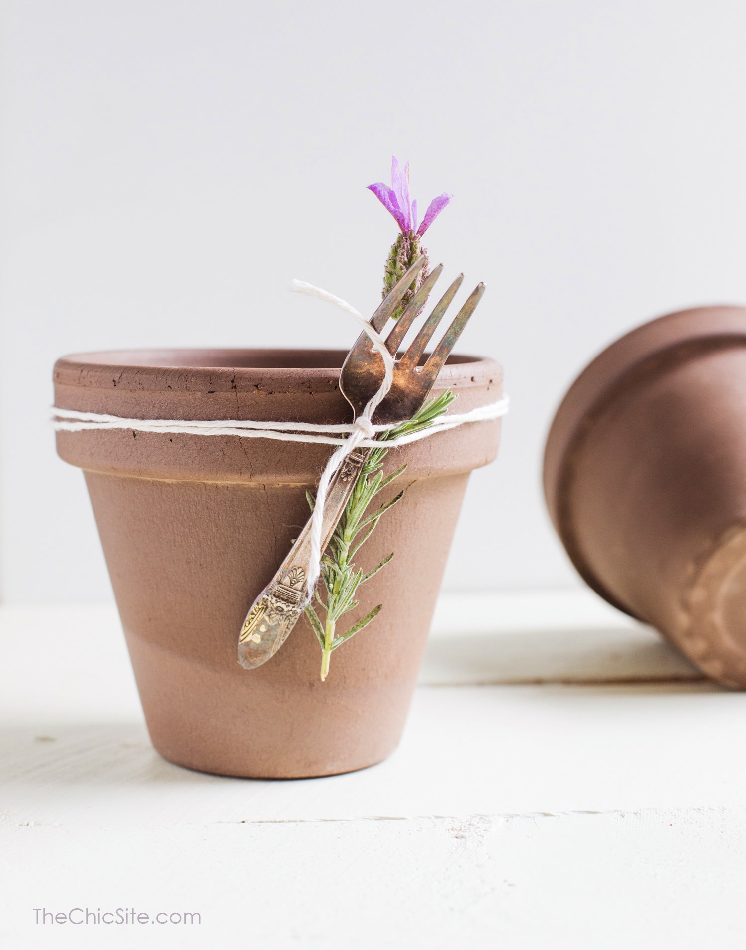 Little flower pots make such charming silverware holders for spring and summer parties! I added a little lavender sprig and my Nana’s vintage forks to give them a sweet little makeover that’s so easy anyone can do the same! ~Rachel